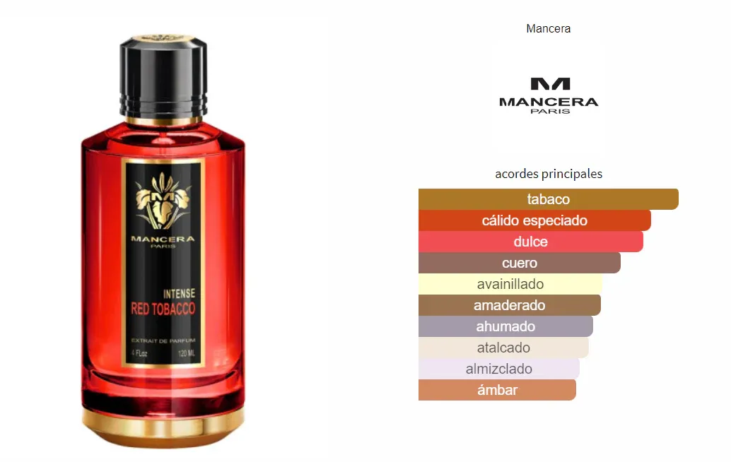 Mancera Red Tobacco es una fragancia cautivadora y sofisticada que combina notas de tabaco, especias y cuero. Perfecta para el hombre moderno y elegante que busca destacar su personalidad única. Experimenta la seducción y el lujo con esta fragancia exclusiva de Mancera.
