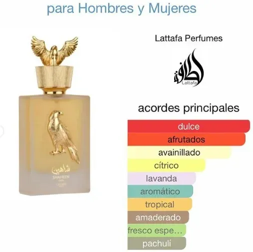 Lattafa Shaheen Gold es una fragancia lujosa y cautivadora que te transportará a un mundo de elegancia y sofisticación. Con notas exquisitas que perduran todo el día, esta esencia te hará destacar en cualquier ocasión. ¡Descubre la magia de Shaheen Gold y déjate envolver por su encanto irresistible!