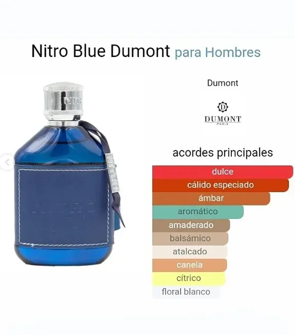 Nitro Blue de Dumont es una fragancia de la familia olfativa Ámbar Amaderada para Hombres. Nitro Blue se lanzó en 2020. Las Notas de Salida son salvia, limón (lima ácida), canela, flor de azahar del naranjo y albahaca; las Notas de Corazón son bálsamo de Tolú, cardamomo negro, praliné y notas amader...
