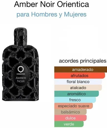 Orientica Amber Noir es una fragancia unisex que cautiva con su misteriosa y seductora combinación de ámbar y notas orientales. Ideal para hombres y mujeres que buscan un aroma sofisticado y duradero. ¡Déjate envolver por esta esencia única y elegante!