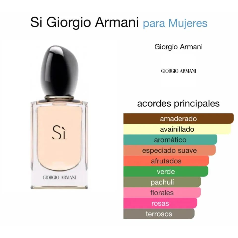Sì de Giorgio Armani es una fragancia elegante y sofisticada que encarna la feminidad moderna. Con notas de cassis, rosa de mayo y pachulí, este perfume cautivador es perfecto para la mujer segura de sí misma y con un estilo único. ¡Hazte notar con Sì!
