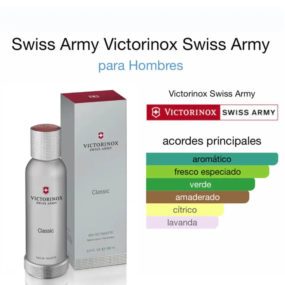 Swiss Army de Victorinox es una fragancia de la familia olfativa Amaderada Aromática para Hombres. Swiss Army se lanzó en 1997. Las Notas de Salida son menta, notas verdes, bergamota, yuzu y jengibre; las Notas de Corazón son lavanda, romero, hojas de violeta, flor de las nieves (flor de edelweiss) ...