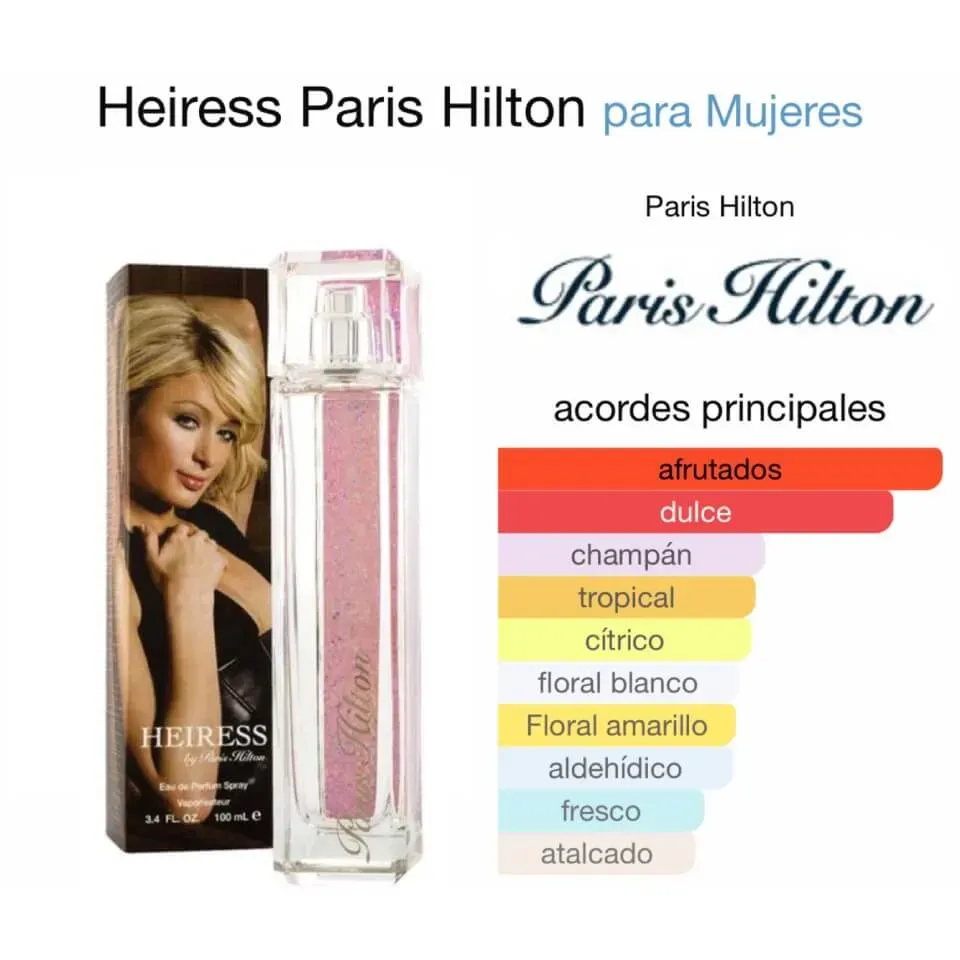 Heiress de Paris Hilton es una fragancia de la familia olfativa Floral Frutal para Mujeres. Heiress se lanzó en 2006. Las Notas de Salida son champaña, maracuyá (fruta de la pasión), durazno (melocotón), mimosa y naranja; las Notas de Corazón son granadina, flor de tiaré, madreselva, ylang-ylang y j...
