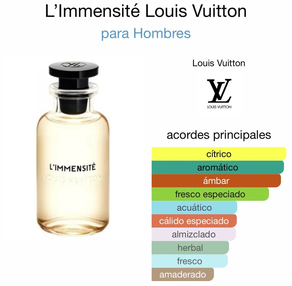 L’Immensité de Louis Vuitton es una fragancia de la familia olfativa Ámbar Especiada para Hombres. L’Immensité se lanzó en 2018. La Nariz detrás de esta fragrancia es Jacques Cavallier. Las Notas de Salida son toronja (pomelo), jengibre y bergamota; las Notas de Corazón son notas acuáticas, salvia, ...