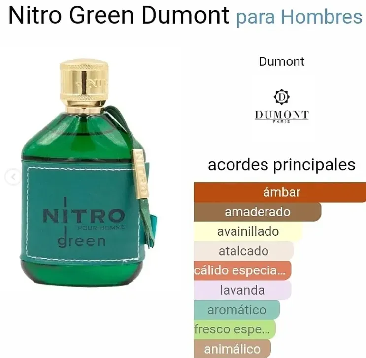 Dumont Nitro Green es un perfume fresco y masculino que combina notas de cítricos, hierbas y madera para crear un aroma elegante y sofisticado. En la cabeza, Nitro Green presenta notas frescas y cítricas de bergamota, limón y mandarina, que proporcionan un toque refrescante y energizante.